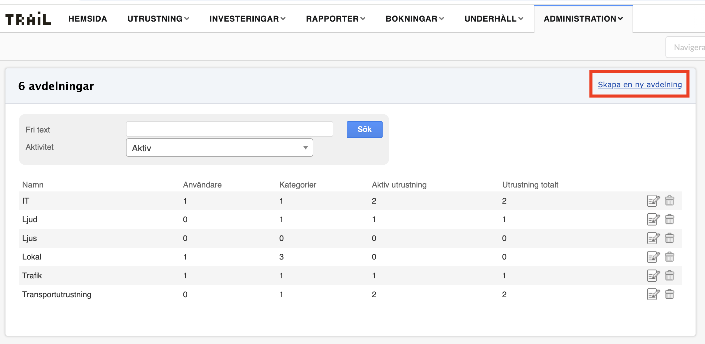 - När Avdelning, kategori och plats är skapade kan du lägga till en utrustning i Trail direkt via systemet.