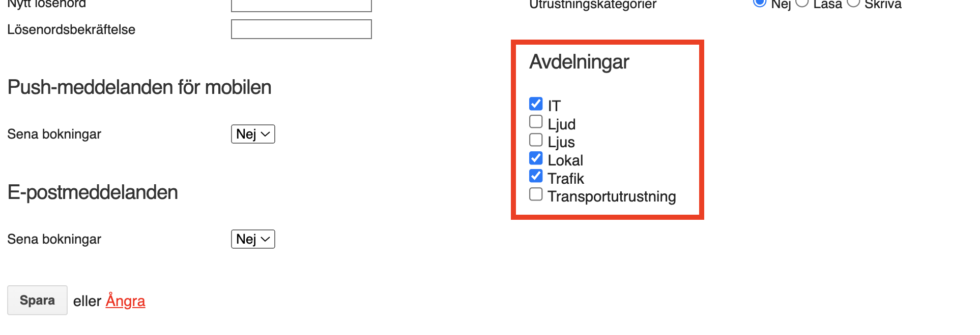 - ❗Avdelningar: Välj till vilken avdelning kategorin ska kopplas. Endast dessa kategorier visas sedan vid skapande eller sökning av utrustning.