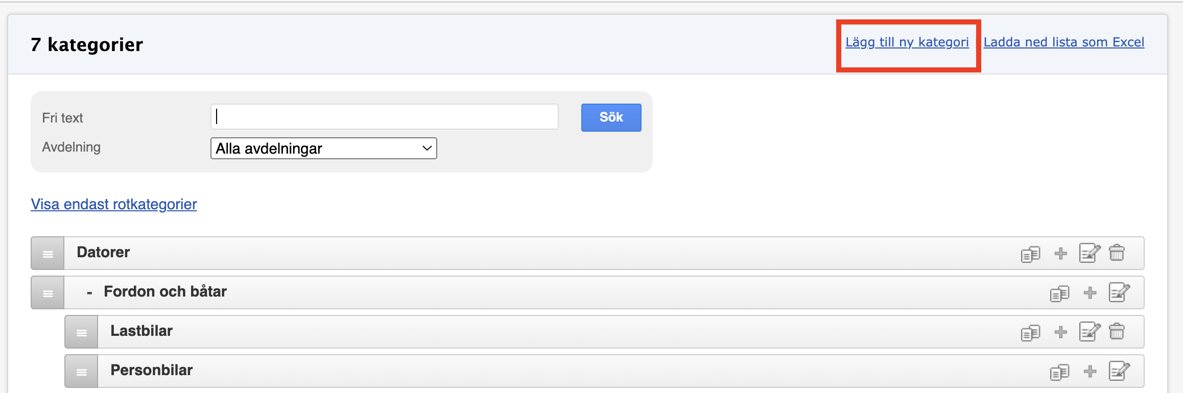 Kategorin grupperar liknande produkter (t.ex. fordon, skåp, datorer). Kategorier är oftast på samma nivå, men du kan också skapa underkategorier (t.ex. Fordon → Personbilar, Lastbilar).