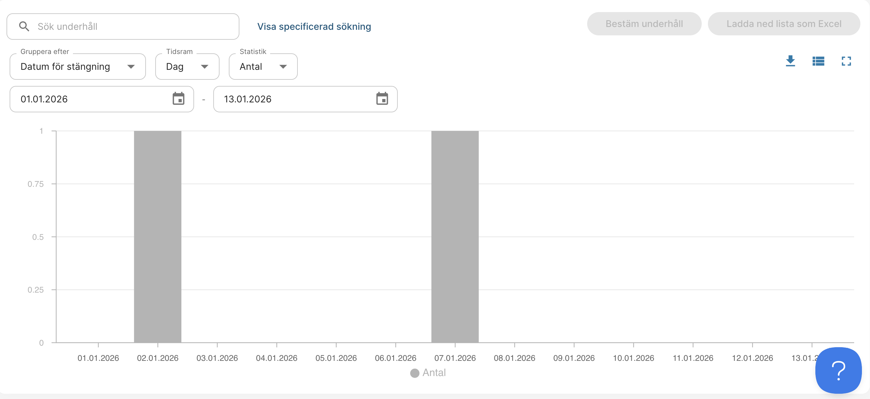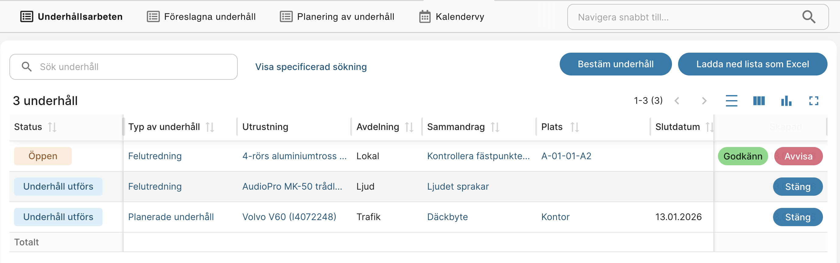 - Stängd under tiden – Sök alla avslutade underhållsuppgifter, t.ex. från år 2025