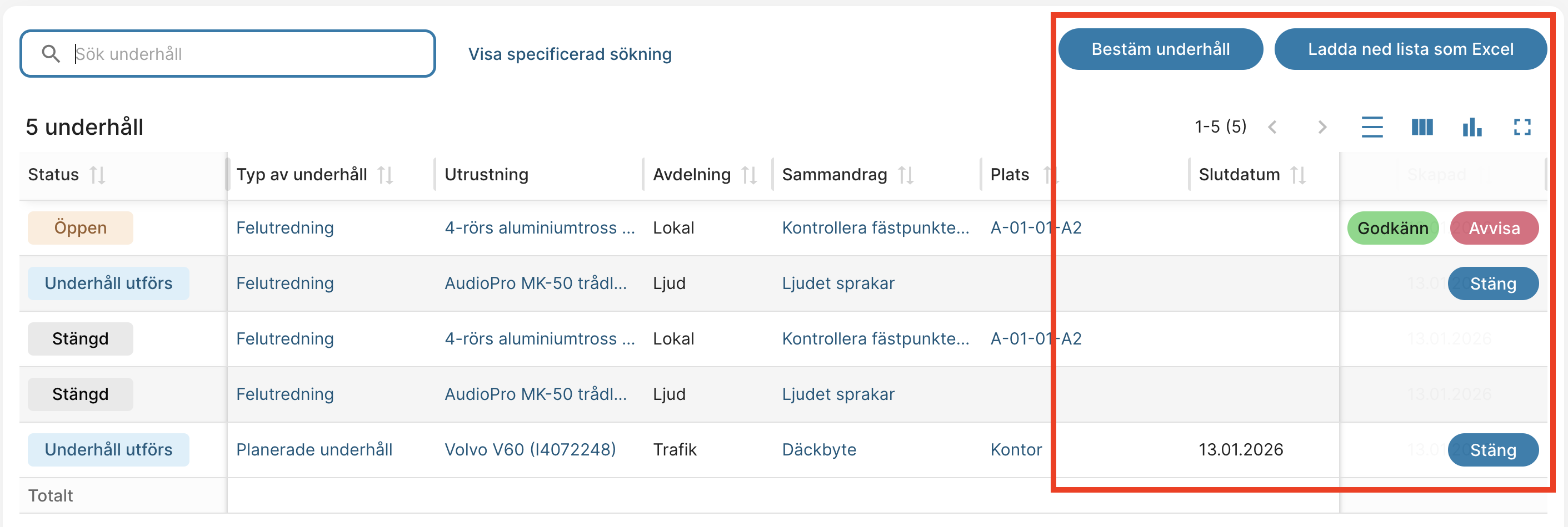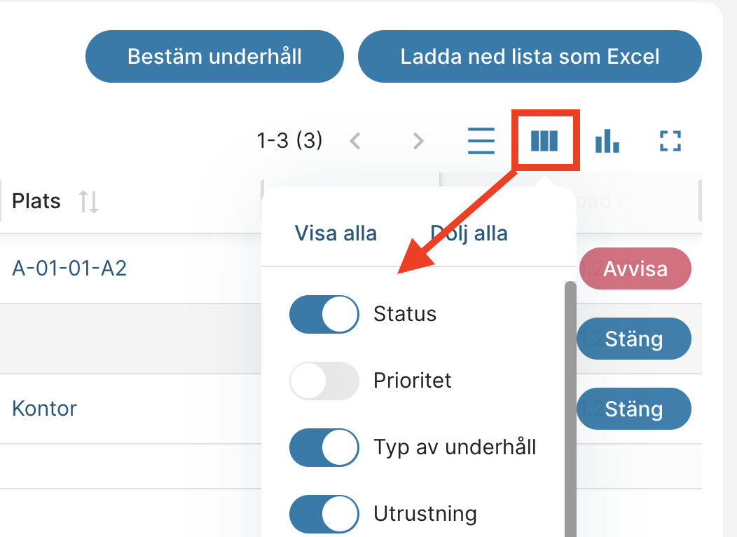 Observera: Exemplen nedan baseras på den kommande förnyade listvyn för underhållsarbeten. Vissa funktioner kanske ännu inte är tillgängliga för alla användare.