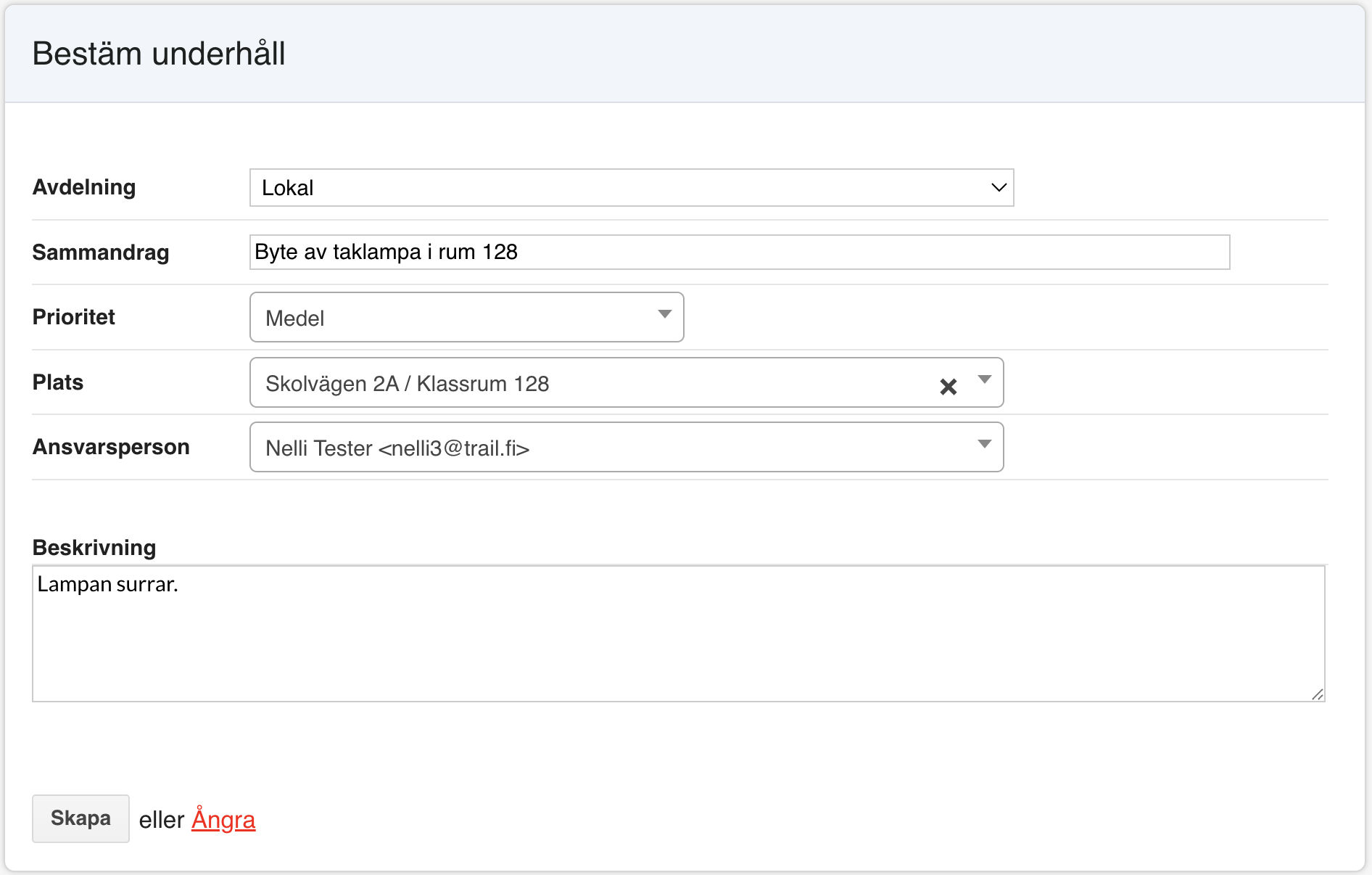 - Avdelning (obligatorisk) – Anger vilken avdelning underhållsarbetet tilldelas och vem som kan se det.