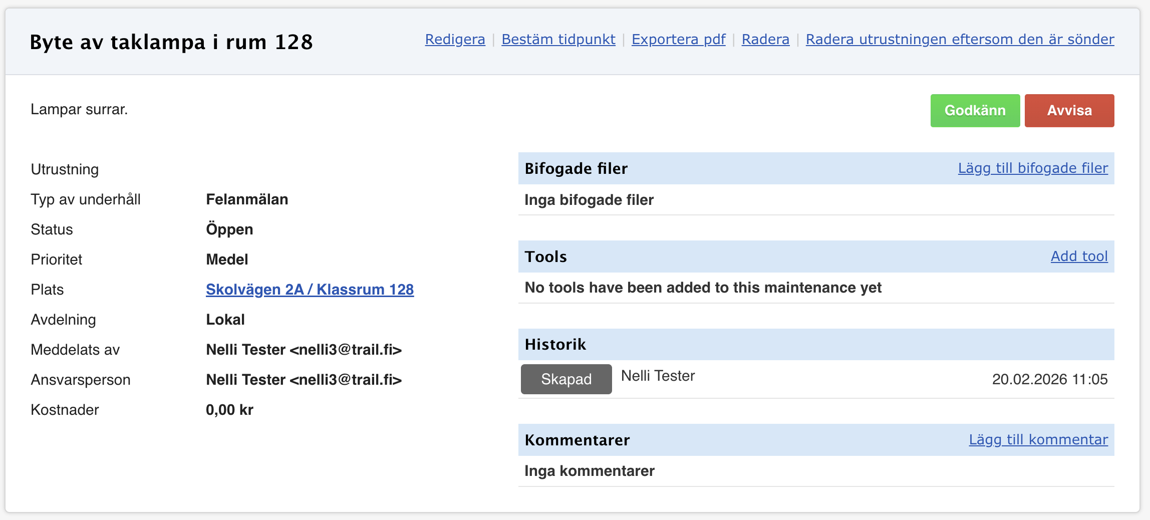 - Godkänn / Avvisa – För öppna felrapporter kan du godkänn ansvaret för uppgiften eller avvisa den som att inget arbete behövs
