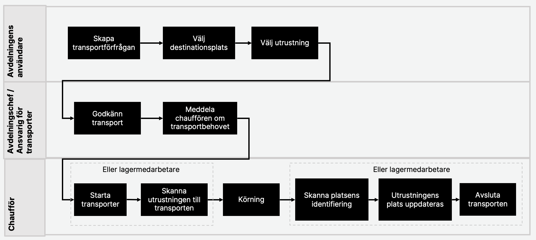 I Trail hjälper transporter till att hantera och följa utrustningens förflyttning mellan olika platser. Följande diagram visar ett exempel på hur transportprocessen kan fortskrida från början till slut med hjälp av Trail’s transportfunktion.