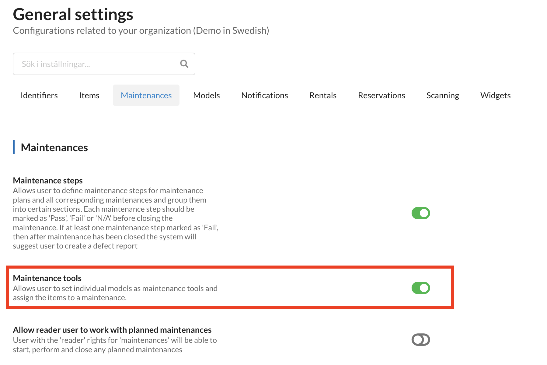 När funktionen är aktiverad kan utrustningar kopplas till underhåll som verktyg.