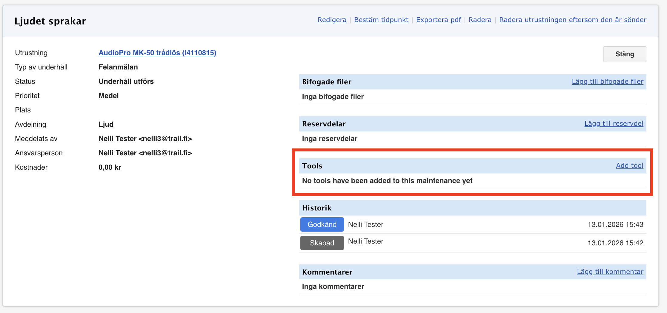 - Vid behov kan uppgifter om underhållsverktyg även läggas till i samband med att underhållet stängs.