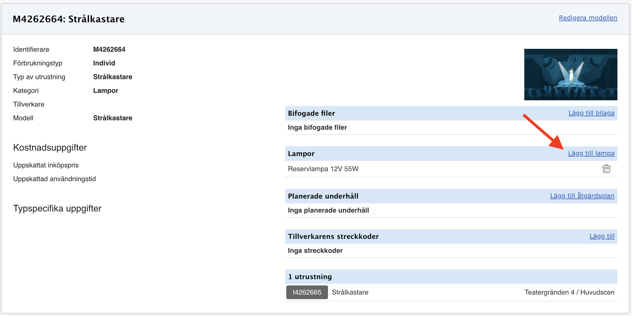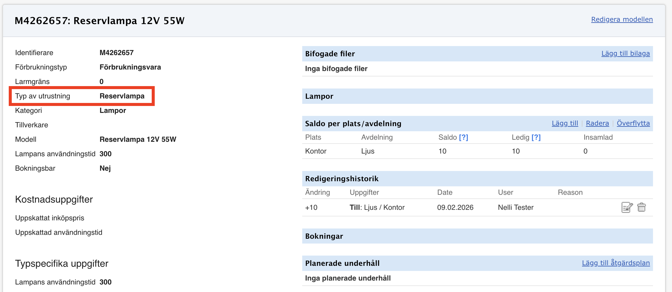 I denna guide beskrivs hur en reservlampa för strålkastare kan registreras på utrustningen och hur lampbytet dokumenteras i underhåll. Detta säkerställer att reservlampor och deras användning syns korrekt i systemet och att lagersaldot hålls uppdaterat.