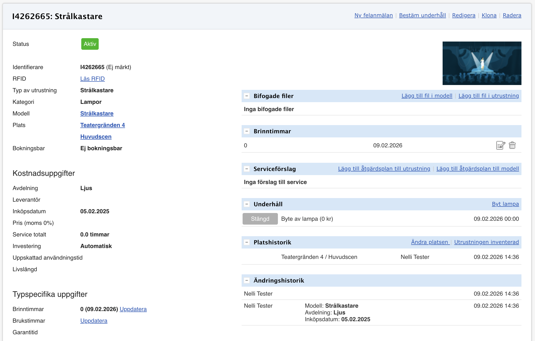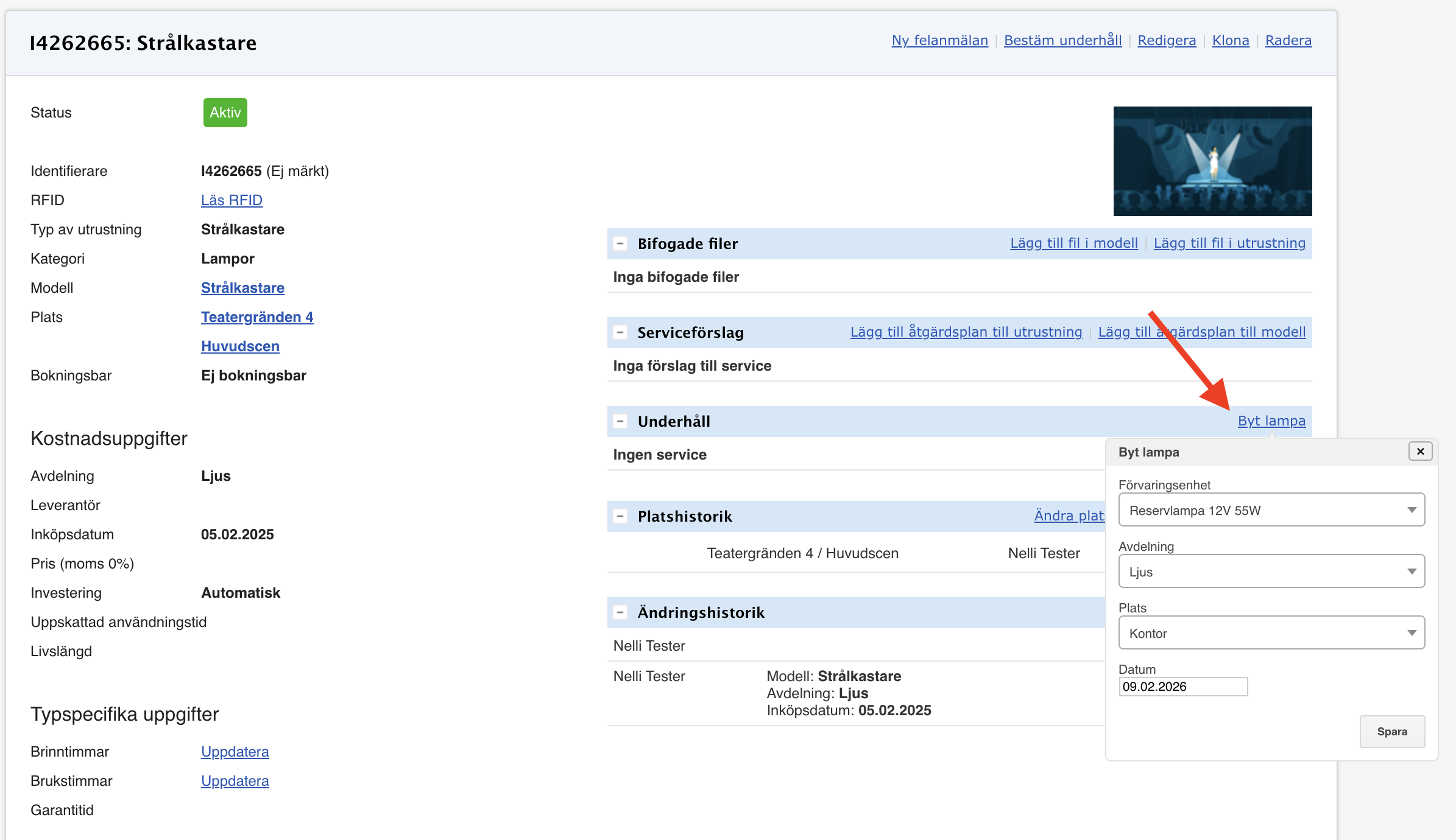 - Lampbytet registreras i underhållshistoriken under Underhåll.