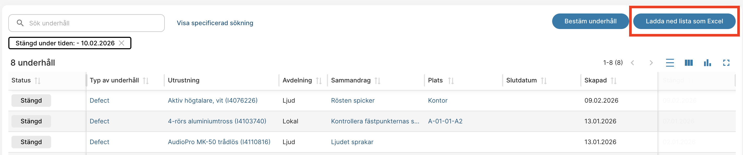- Möjlighet till specificerad sökning, t.ex. efter plats, typ av underhåll eller stängningsdatum