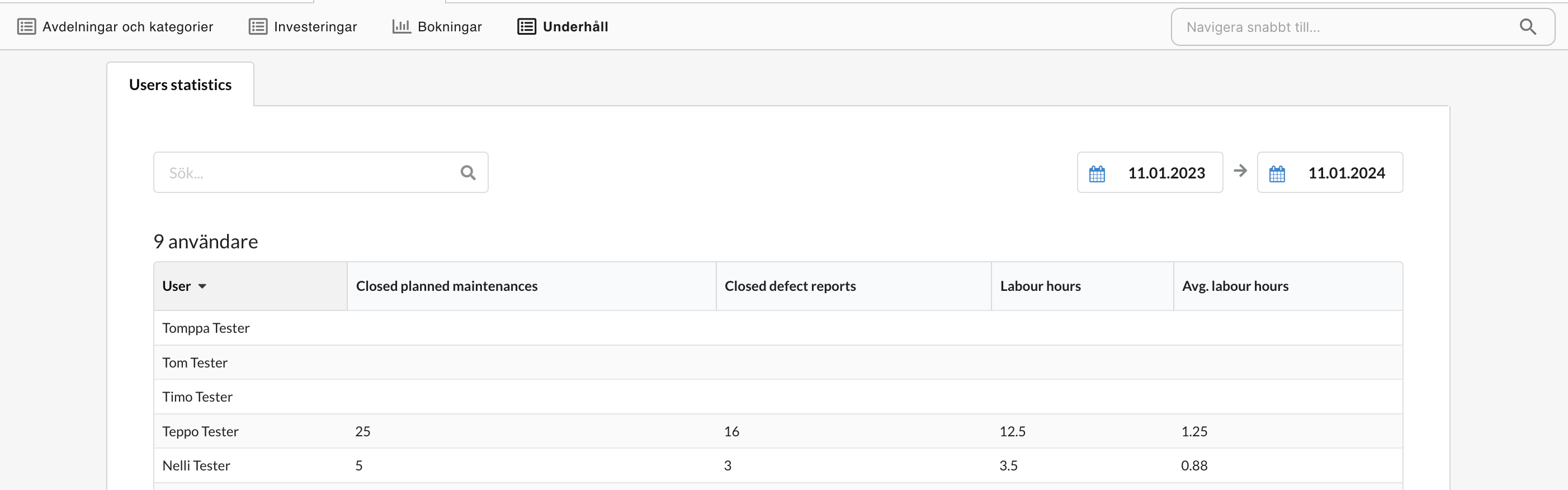 - Visar per användare hur många felanmälningar eller periodiskt underhåll varje användare har stängt