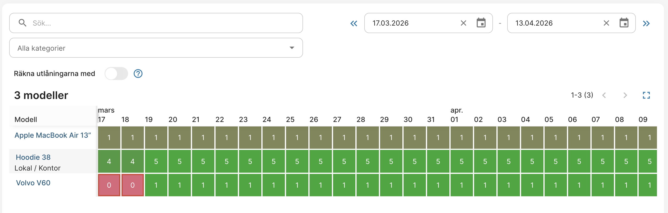 Med hjälp av modellkalendern kan du kontrollera hur många utrustningar av varje modell som är tillgängliga vid en viss tidpunkt.