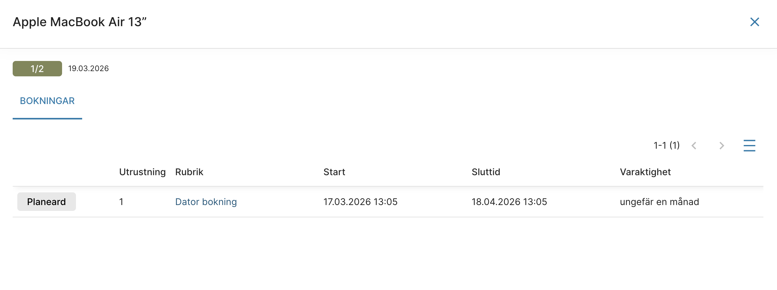 - I vyn visas utrustningen som bokad så länge bokningens tidsperiod pågår – även om utrustningen har återlämnats i förtid.