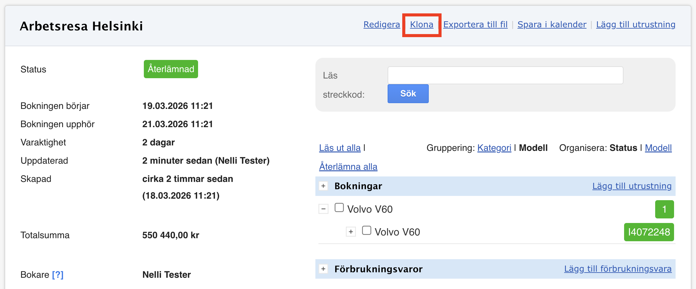 Vad innebär kloning av en bokning? Du kan skapa en ny bokning baserat på en befintlig bokning. Detta är särskilt användbart när du gör liknande bokningar vid flera tillfällen och behöver samma utrustningsmodeller och antal.