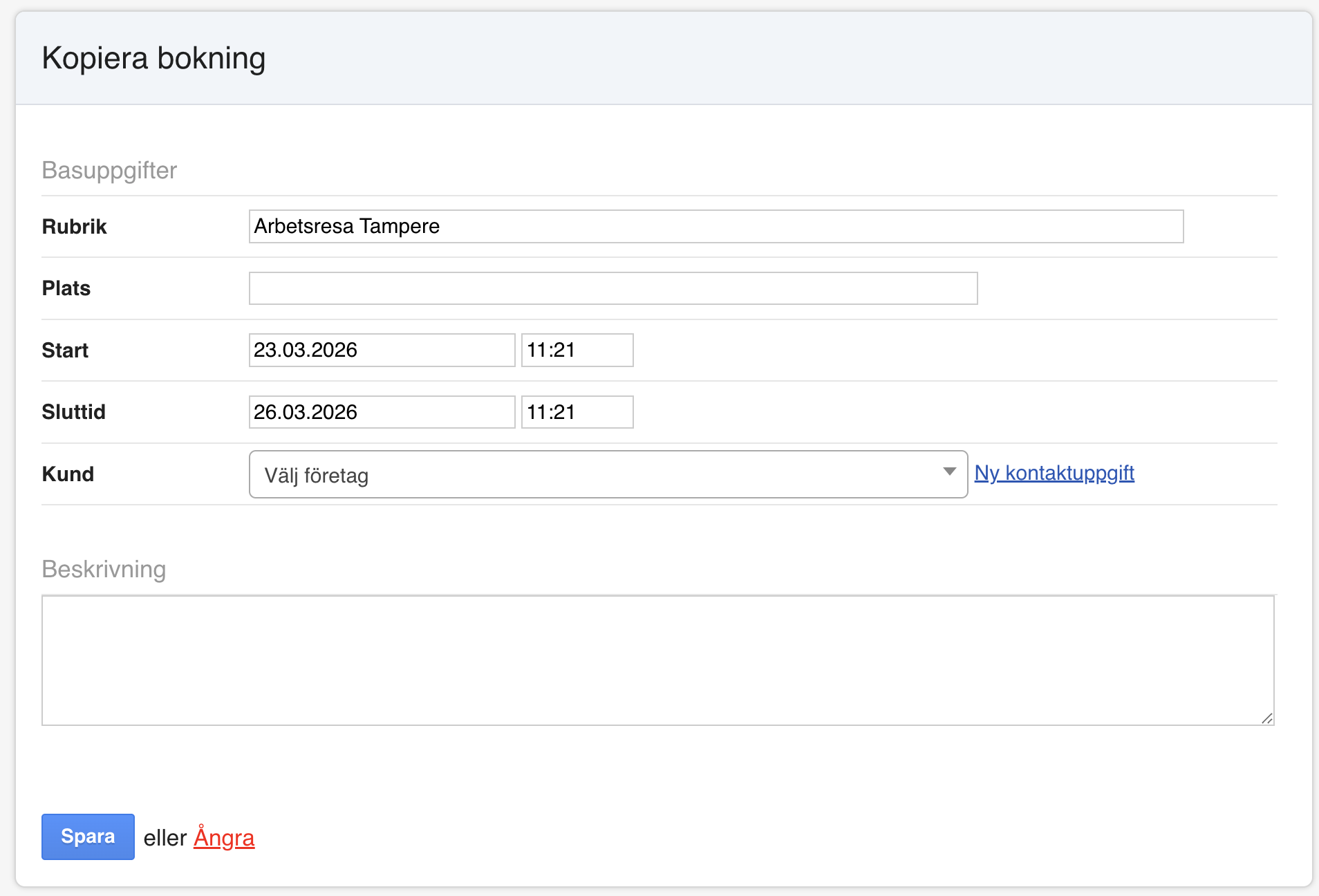 - Den nya bokningens vy öppnas