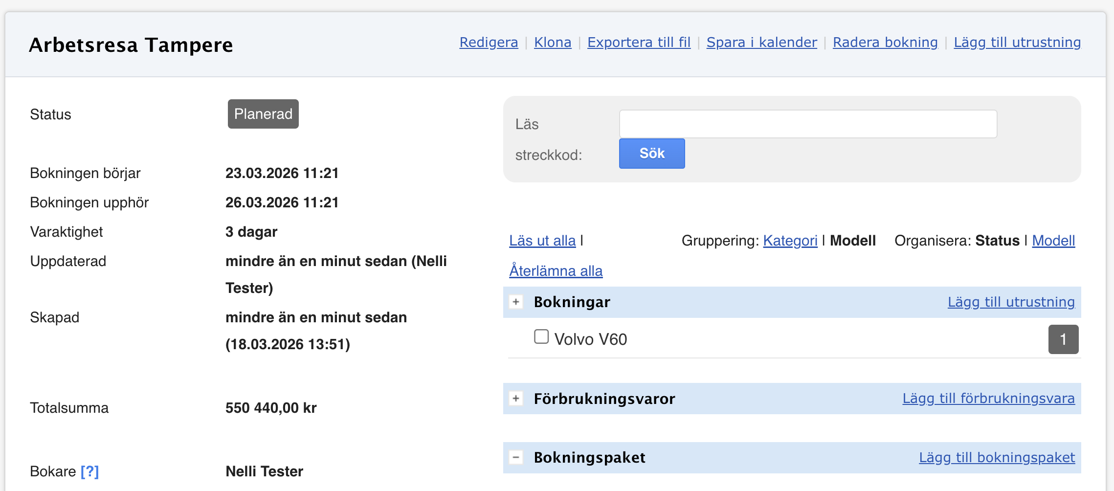 - Utrustningsmodeller och antal har lagts till automatiskt som grund för den nya bokningen