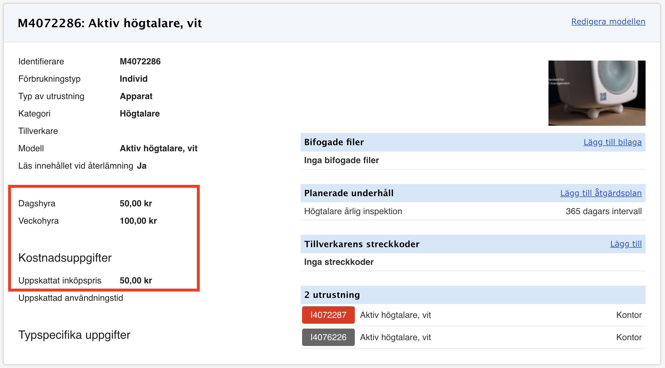 Ange hyrespriser för utrustningsmodeller