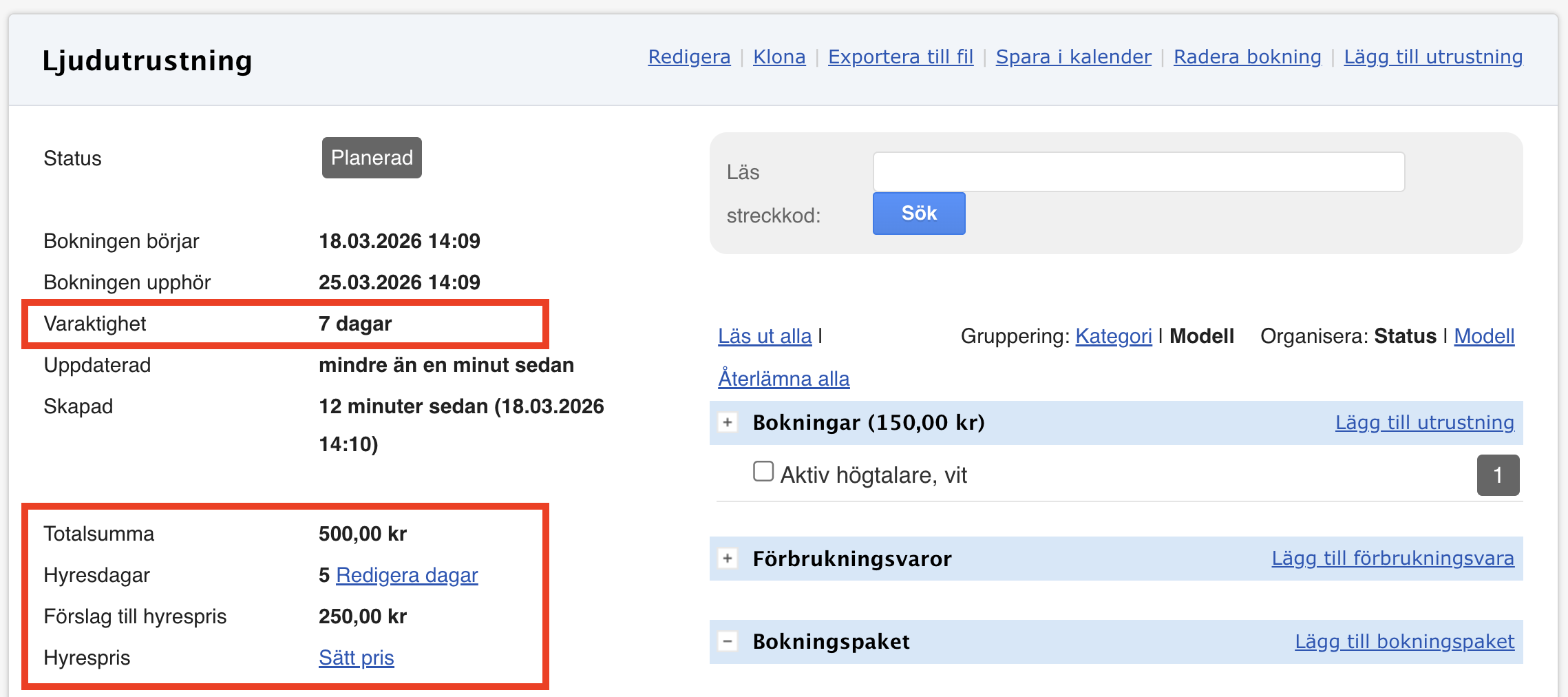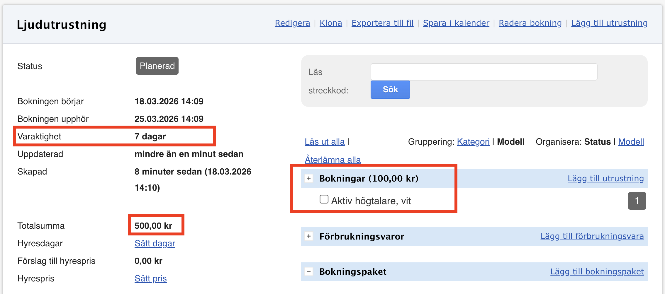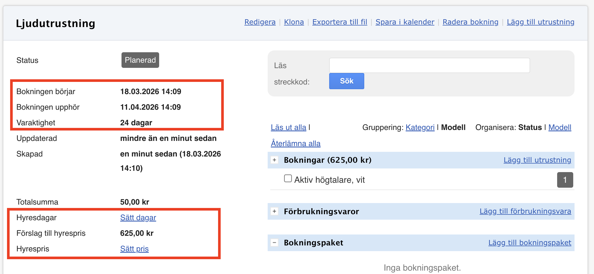 - Lägg till utrustning i bokningen