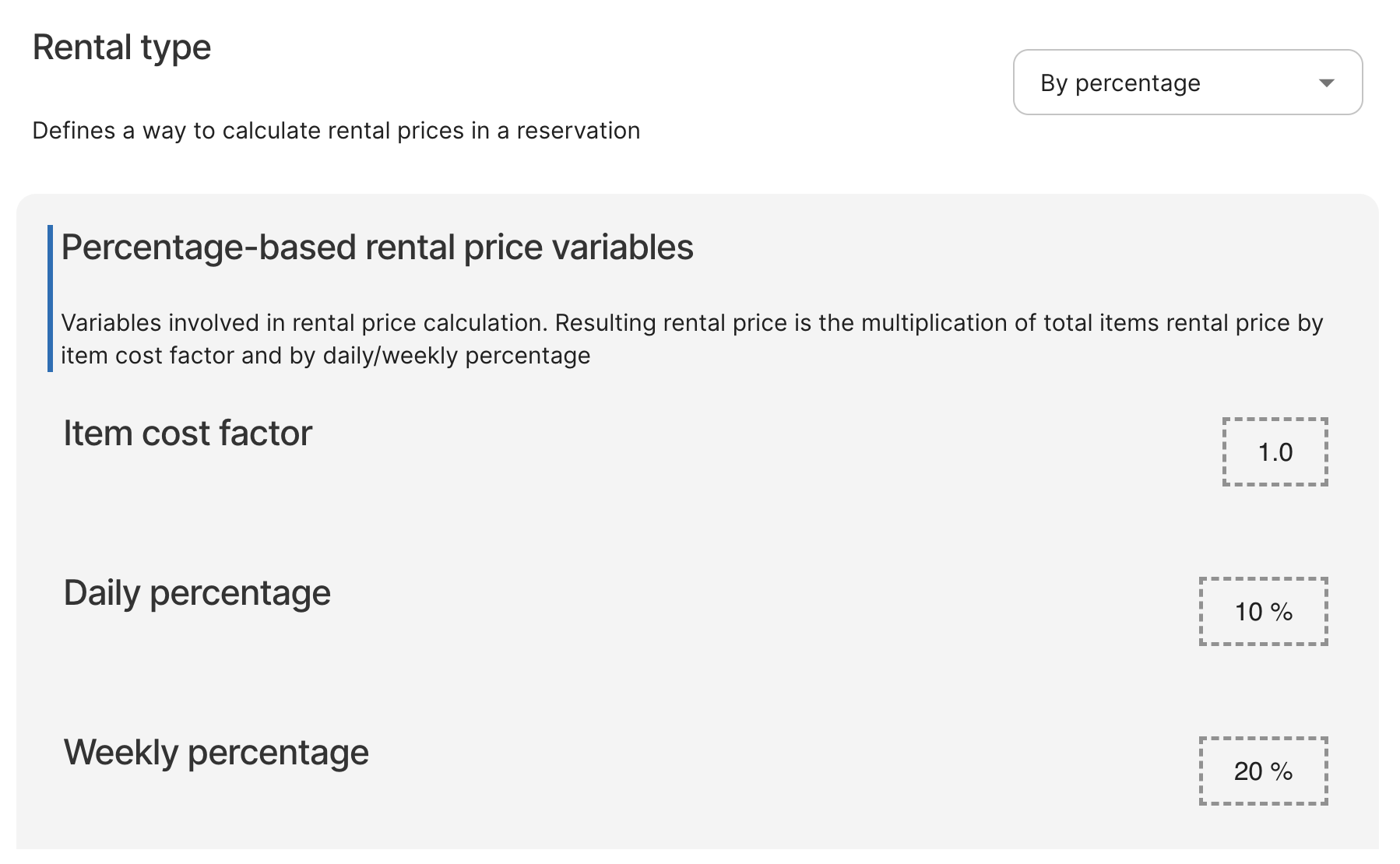 Administration → Allmänna inställningar → Uthyrning (Rentals) → Hyrestyp (Rental type)